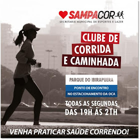 Parque Ibirapuera, há o Sampacor – Clube de corrida e caminhada, que se reúne todas as segundas, das 19h às 21h, no estacionamento em frente à Oca. É grátis!